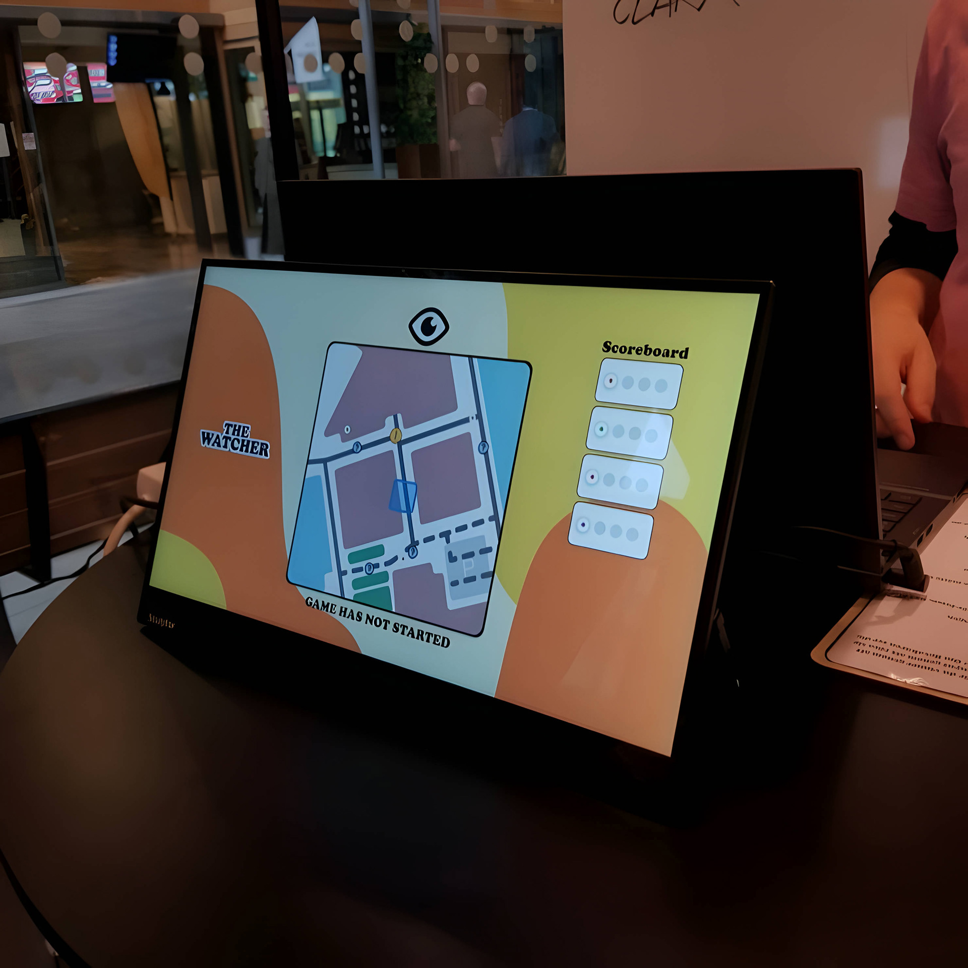 After completion, The Watcher were presented at the 2022 Interaction design Exhibition day at the Visual Arena, Campus Lindholmen Chalmers University of Technology. During the exhibition, Generation Pep and the public participated in play-tests and evaluations. At the booth, ongoing play-tests were at a screen for to catch by-passers interest.